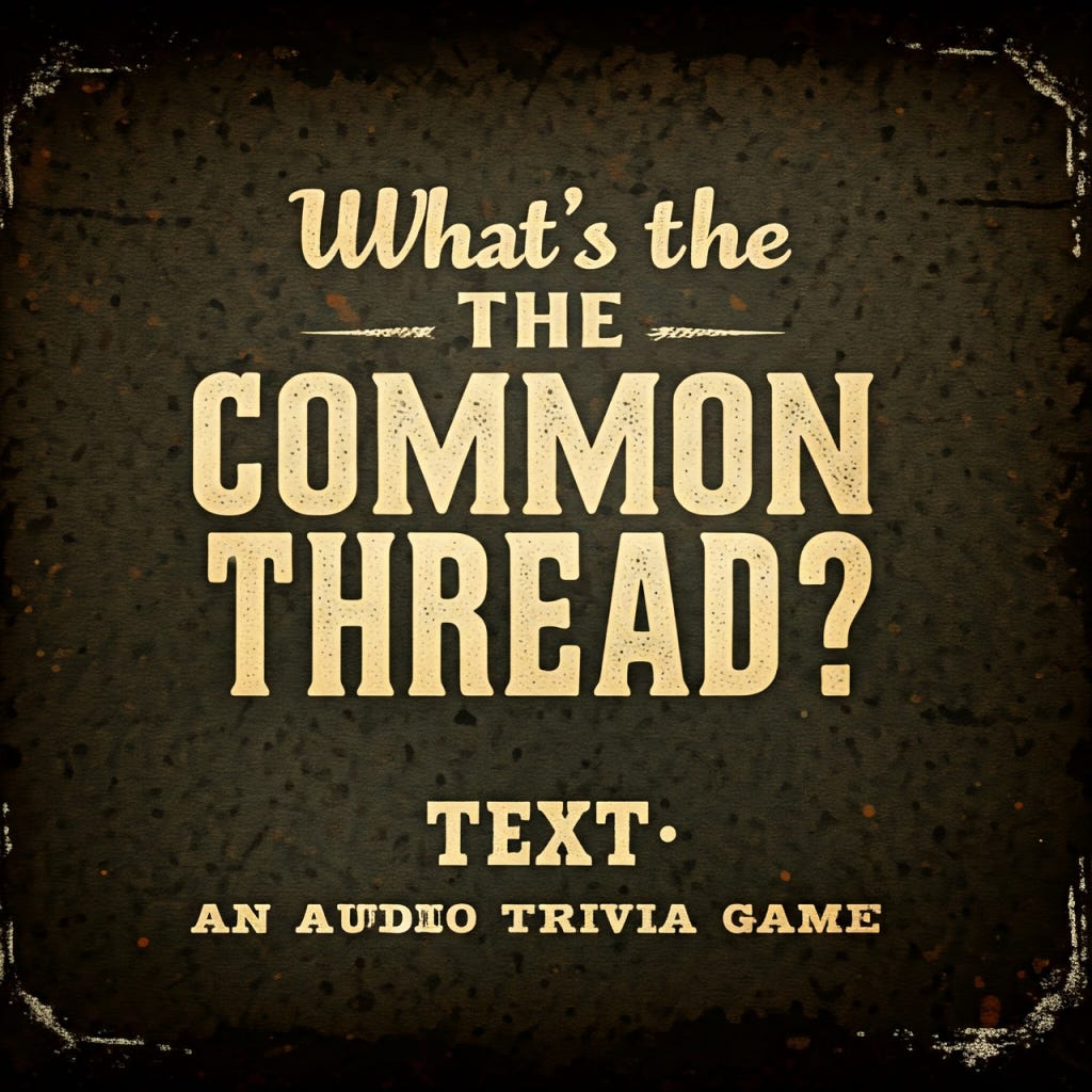 What's the Common ThreadWhat's the Common Thread 1211×0:00Current time: 0:00 / Total time: -23:42-23:42Audio playback is not supported on your browser. Please upgrade.What's the Common Thread 12A Music Trivia Game & Educational ExperiencePacific St Blues and AmericanaJan 16, 20251ShareTranscriptJoe Bonamassa / Nobody Loves Me But My MotherPeter Frampton / The Thrill is GoneAretha Franklin / The Night LifeShaun Murphy / Sweet Little AngelShare What's the Common Thread - A Music Trivia GameDiscussion about this episodeCommentsRestacksWhat's the Common ThreadAn Audio Music Trivia Game where we play four songs and you figure out what ties them all together.An Audio Music Trivia Game where we play four songs and you figure out what ties them all together.SubscribeListen onSubstack AppSpotifyRSS FeedAppears in episodePacific St Blues and AmericanaRecent EpisodesWhat's the Common Thread #35 Jun 24, 2025 • Pacific St Blues and AmericanaWhat's the Common Thread #34 Jun 17, 2025 • Pacific St Blues and AmericanaWhat's the Common Thread #33Jun 10, 2025 • Pacific St Blues and AmericanaWhat's the Common Thread #32Jun 10, 2025 • Pacific St Blues and AmericanaWhat's the Common Thread #31Jun 3, 2025 • Pacific St Blues and AmericanaWhat's the Common Thread #30May 28, 2025 • Pacific St Blues and AmericanaWhat's the Common Thread #29May 21, 2025 • Pacific St Blues and AmericanaWhat's the Common Thread #28May 14, 2025 • Pacific St Blues and Americana